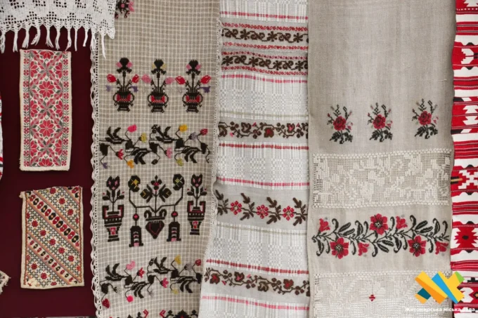 Демонструють рушники, виконані у різних техніках, які поширені в різних регіонах нашої країни. Загалом представлено 25 регіонів.