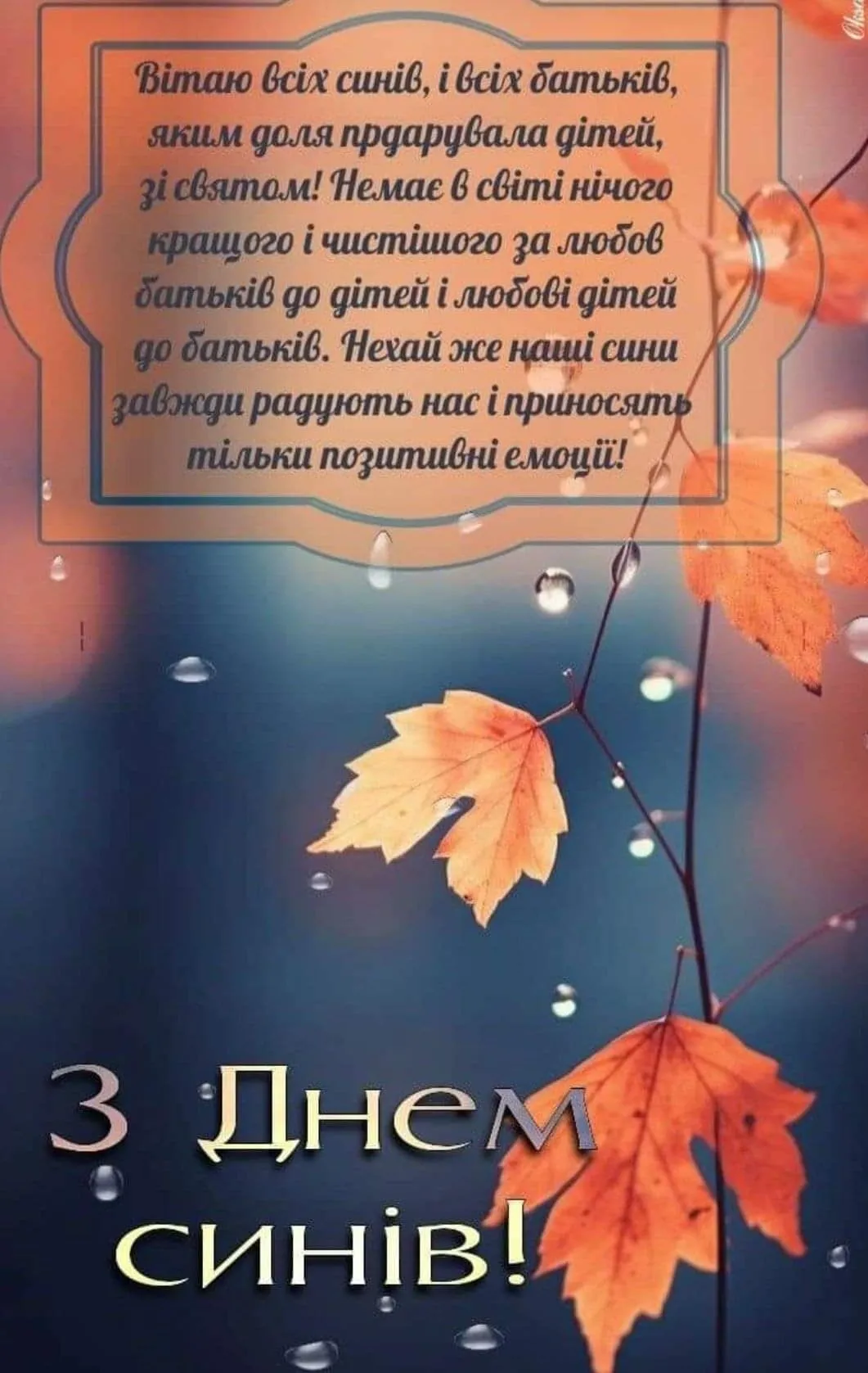 Не забудьте цього дня сказати своїм синам: «Я тебе люблю і пишаюся тобою». Надішліть листівку, поділіться привітанням — подаруйте їм радість цього дня!
