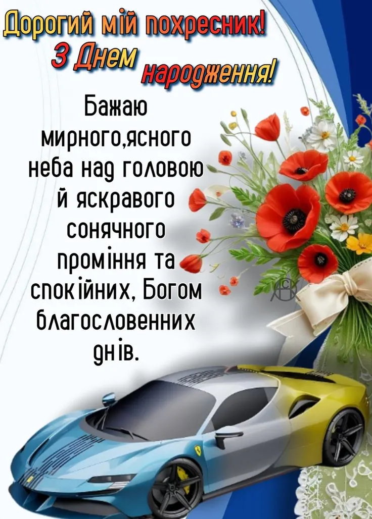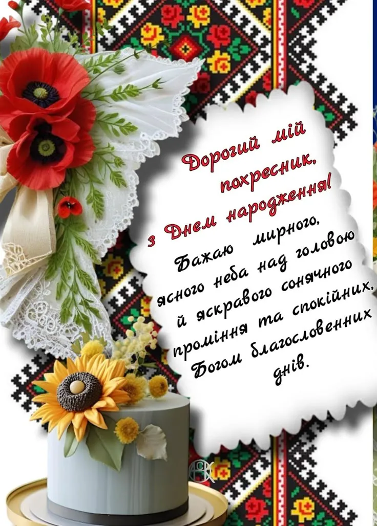 Мій дорогий похреснику, вітаю тебе з днем народження. Нехай у твоєму житті завжди буде світло — навіть у найважчі дні. Бажаю сили духу, мудрих рішень, справжніх людей поруч і віри в себе. Я завжди поруч і щиро пишаюся тобою.