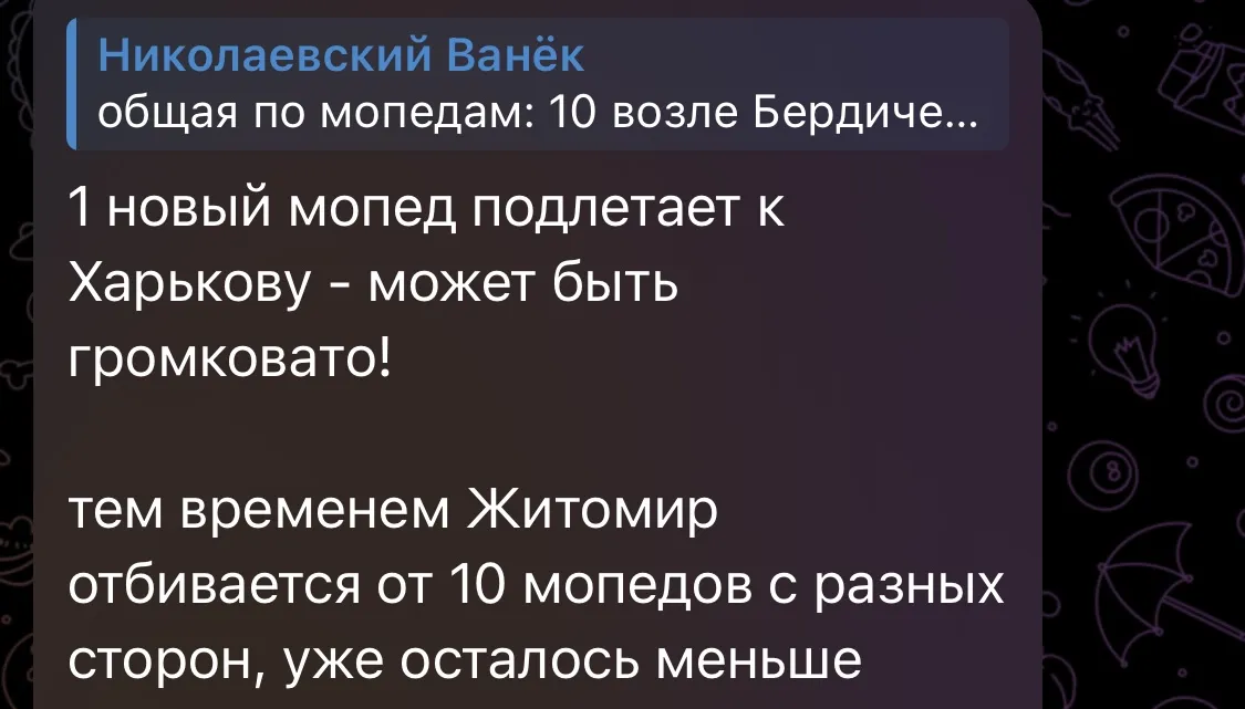 Телеграм-канал «Николаевский Ванек» пише, що Житомир відбивається від десяти БПЛА з різних сторін. Також повідомляється про безпілотники над Коростенем та Бердичевим.
